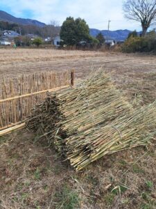 切った篠竹は、もったいないので、青竹はキャンプ場の垣根に。
